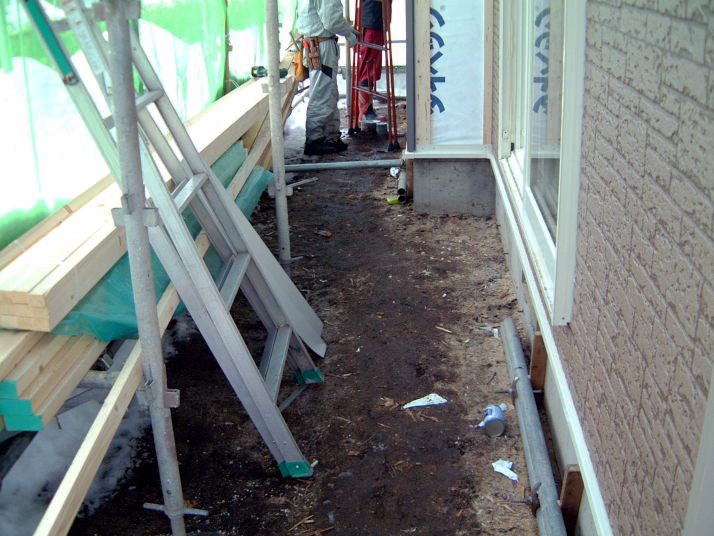 外装サイディング貼り作業風景。作業中、外壁建材等に、雪や雨がふりかかることはありませんでした。